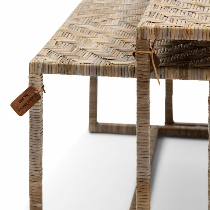 La Mesa de Centro Medan consta de un conjunto de tres mesas con un tablero de piel de ratán. Los tableros de la mesa están tejidos a mano con un patrón mozáico. El marco de estas mesas de comedor también está hecho de ratán. Use las mesas juntas o simplemente coloque una debajo de la otra. La serie Medan también cuenta con una mesa auxiliar (juego de tres).