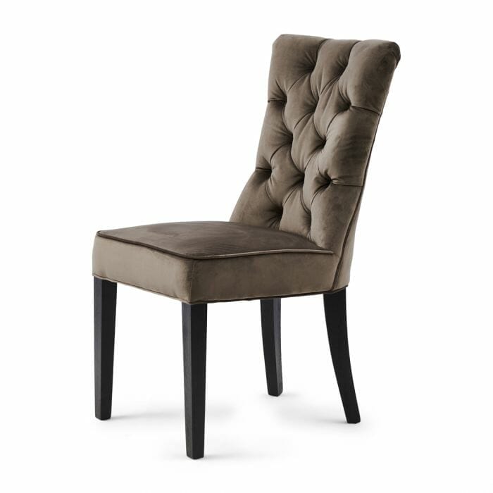A classic dining chair with a modern touch. Straight seat and backrest, no armrests, and a beautiful tufted back that adds a luxurious feel. Soft velvet, and legs sustainably sourced from old rubber trees.